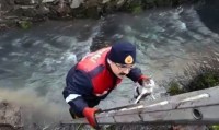 merdiven ile dere yatağına inerek yavru kediyi kurtardı. İtfaiye ekiplerince