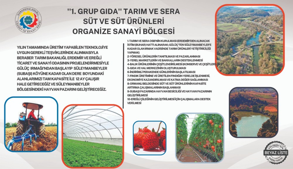 1-Tarım ve Sera OSB’nin kurulması (Erdemir’den alınacak istim (buhar) hattı alınarak; Gülüç’ten Süleymanbeyler’e kadar olan Irmak vadisinde tarım ürünleri yetiştiriciliği yapmak)