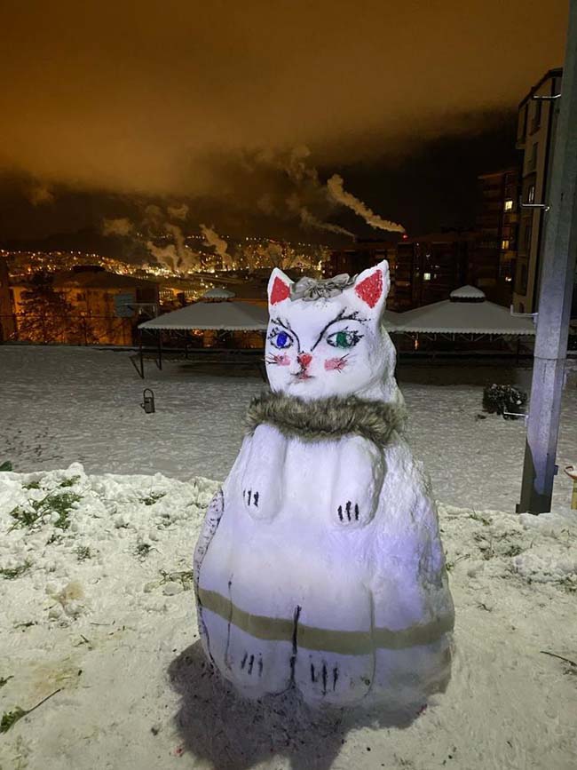 Kar yağışını fırsata çeviren Ummak, büyük bir emek harcayarak tamamladığı kardan kediyi çeşitli süslemelerle donattı. Ummak, "Yoğun kar yağışı nedeniyle dışarı çıkmak zorlaşsa da biz bu durumu eğlenceli hale getirmek istedik. Günlerdir yağan karı değerlendirerek büyük bir kardan kedi yapmaya karar verdik." dedi.