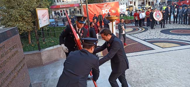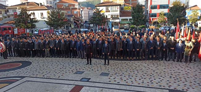 Törenlere ilçe Kaymakamı Muhammed Evlice ve Devrek Belediye Başkanı Çetin Bozkurt'un Cumhuriyet Alanında bulunan anıta çelenk sunulmasıyla başlandı. İki dakika saygı duruşu ve İstiklal Marşı'nın okunmasının ardından buradaki tören sona erdi.