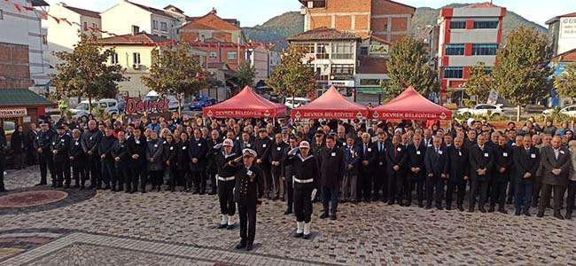 Zonguldak'ın Devrek İlçesinde 10 Kasım Atatürk'ü anma programı, çeşitli etkinliklerle gerçekleştirildi. Mustafa Kemal Atatürk'ün vefatının 86. yıldönümü nedeniyle hazırlanan anma programı protokol heyetinin katılımı ile Cumhuriyet Alanında gerçekleştirildi. Törenlere Devrek Kaymakamı Muhammed Evlice, Garnizon Komutanı Öğretmen Yüzbaşı Aykut Erdogdu, Belediye Başkanı Özcan Ulupınar'ın Cumhuriyet Alanında bulunan anıta çelenk sunulmasıyla başlandı. İki dakikalık saygı duruşu ve İstiklal Marşı'nın okunmasının ardından buradaki tören sona erdi.