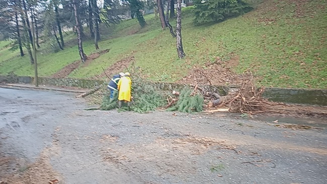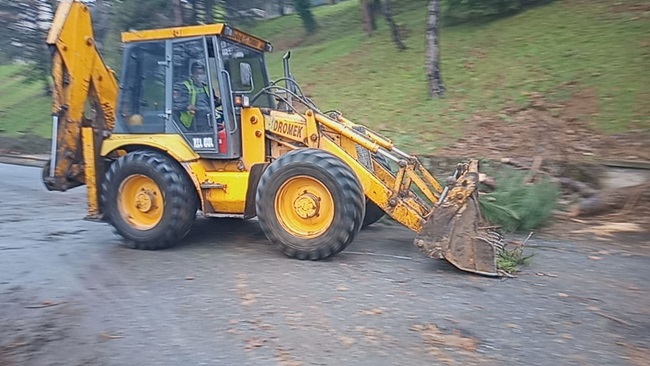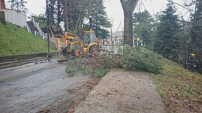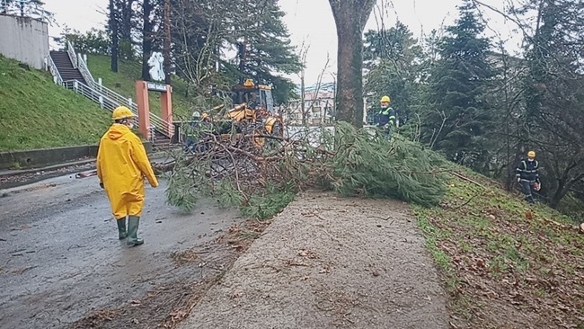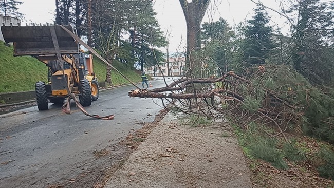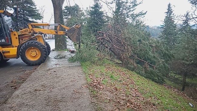 Zonguldak’ın Ereğli ilçesi Lojmanlar bölgesinde yoğun kar yağışı nedeniyle devrilen ağaçlar iş makineleri ve işçiler tarafından kaldırılıyor.