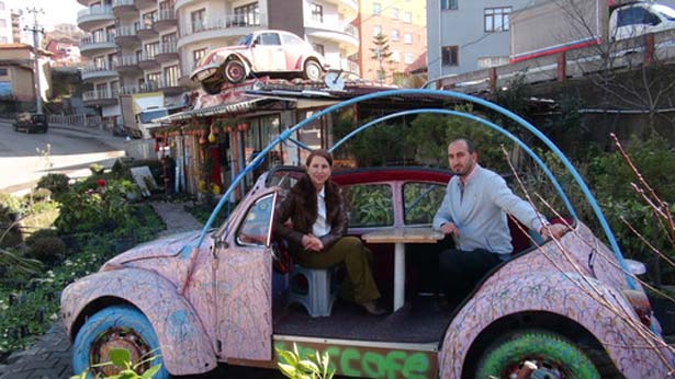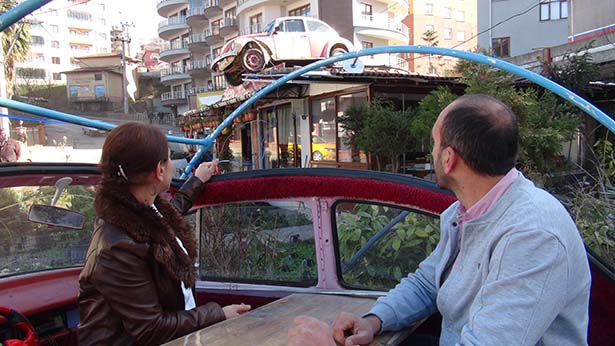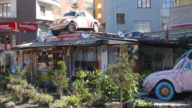 Cadde üzerinde bir iş yerinin üzerine devrilmiş izlenimi veren vosvos, ilginç görüntü oluşturuyor. Çatıdaki vosvosun yanı sıra kafenin bahçesine konulan tarihi vosvos da insanların çay kahve içebilecekleri bir donanım sunuyor.