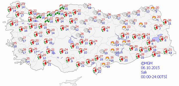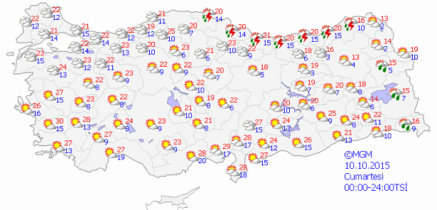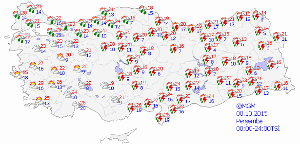Çarşamba günü yağışlı sistemin ülkemizin kuzey ve doğu bölgelerinde etkili olması beklenmektedir. Marmara'nın doğusu, Karadeniz, İç Anadolu'nun kuzey ve doğusu, Doğu Akdeniz ile Doğu ve Güneydoğu Anadolu bölgelerinde görülecek sağanak ve gök gürültülü sağanak şeklindeki yağışların Karadeniz bölgesi kıyı kesimi, Doğu Akdeniz ile Diyarbakır, Batman, Siirt, Elazığ, Bingöl, Tunceli ve Erzincan çevrelerinde kuvvetli ve yer yer çok kuvvetli (21-75 kg/metrekare) olacağı tahmin edilmektedir.