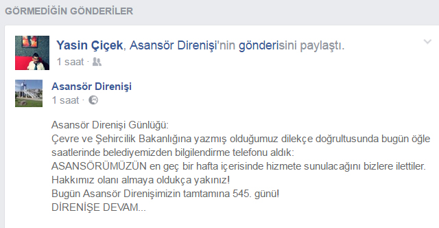 Yasin Çiçek asansörün yapılarak engellilerin hizmetine açılması için başta Ereğli belediye başkanlığı olmak üzere Başbakanlık, Cumhurbaşkanlığı'na dilekçe yazarak sorunu aktarmıştı. Son olarak ise Çevre ve şehircilik bakanlığına dilekçe yazan Yasin Çiçek'in bu dilekçesine Ereğli Belediyesinden telefonla arayarak bilgi verildi.. Söz konusu görüşme ile ilgili olarak sayfasında paylaşım yapan Yasin Çiçek "Asansör Direnişi Günlüğü:Çevre ve Şehircilik Bakanlığına yazmış olduğumuz dilekçe doğrultusunda bugün öğle saatlerinde belediyemizden bilgilendirme telefonu aldık: ASANSÖRÜMÜZÜN en geç bir hafta içerisinde hizmete sunulacağını bizlere ilettiler.Hakkımız olanı almaya oldukça yakınız!Bugün Asansör Direnişimizin tamtamına 545. günü! DİRENİŞE DEVAM.." dedi.