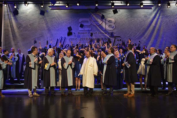 Dönem birincisi Merve Demir'e Rektör Prof. Dr. Mustafa Çufalı mezuniyet diplomasını takdim etti. Demirin, mezuniyet kütüğüne plaket çakmasının ardından mezun öğrencilere diplomaları verildi. Mezuniyet Töreni, mezun öğrencilerin coşkuyla keplerini fırlatmasıyla sona erdi.