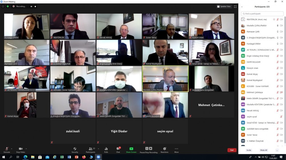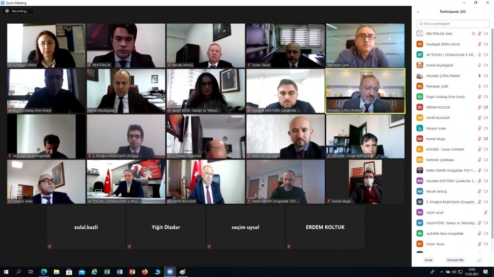Zonguldak Bülent Ecevit Üniversitesi Kalite Komisyonu yıllık dış paydaş toplantısını çevrimiçi olarak gerçekleştirdi. Kalite Komisyonu Başkanı olarak Rektör Prof. Dr. Mustafa Çufalı'nın açılışını yaptığı toplantıya Rektör Yardımcısı Prof. Dr. Kemal Büyükgüzel ve dış paydaş temsilcileri olarak Zonguldak Valiliği, Zonguldak Belediye Başkanlığı, İl Milli Eğitim Müdürlüğü, Sanayi ve Teknoloji İl Müdürlüğü, İl Kültür ve Turizm Müdürlüğü, Batı Karadeniz Kalkınma Ajansı (BAKKA), Küçük ve Orta Ölçekli İşletmeleri Geliştirme ve Destekleme İdaresi Başkanlığı (KOSGEB), Zonguldak Ticaret ve Sanayi Odası, Eren Enerji, Ereğli Demir Çelik Sanayi A.Ş., Çanakçılar Seramik Sanayi ve Ticaret A.Ş., Tat Metal Çelik Sanayi A.Ş. temsilcileri katıldı.