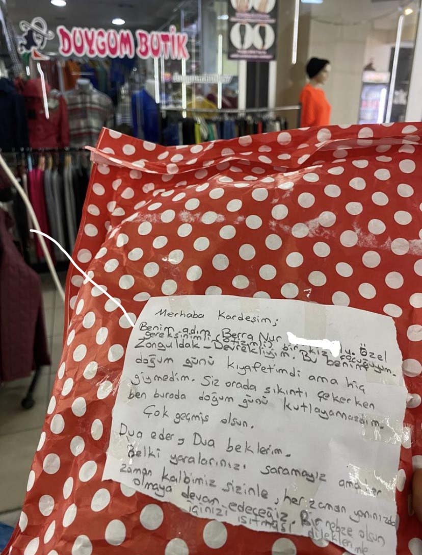 "Merhaba kardeşim benim adım Berranur otizmli bir bireyim. Zonguldak Devrekliyim. Bu benim doğum günü kıyafetim. Siz orada sıkıntı yaşarken burada ben bunu giyemem. Sizlere çok dua ediyorum. Sizin yaralarınızı saramayız ama kalbimiz daima sizinle. Bir nebze olsun içinizi ısıtmak istedim."