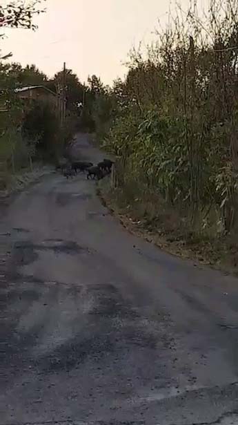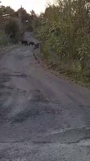 Zonguldak'ın Alaplı ilçesinde yiyecek aramaya çıkan domuz sürüsü ilçe merkezinde 7 kilometre uzaklıkta bulunan köye indi. Domuz sürülerini karşısında gören bir vatandaş ise o anları cep telefonuna kaydetti.