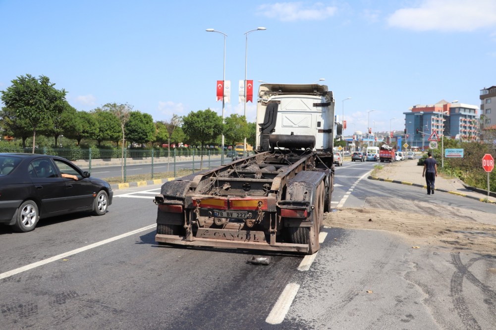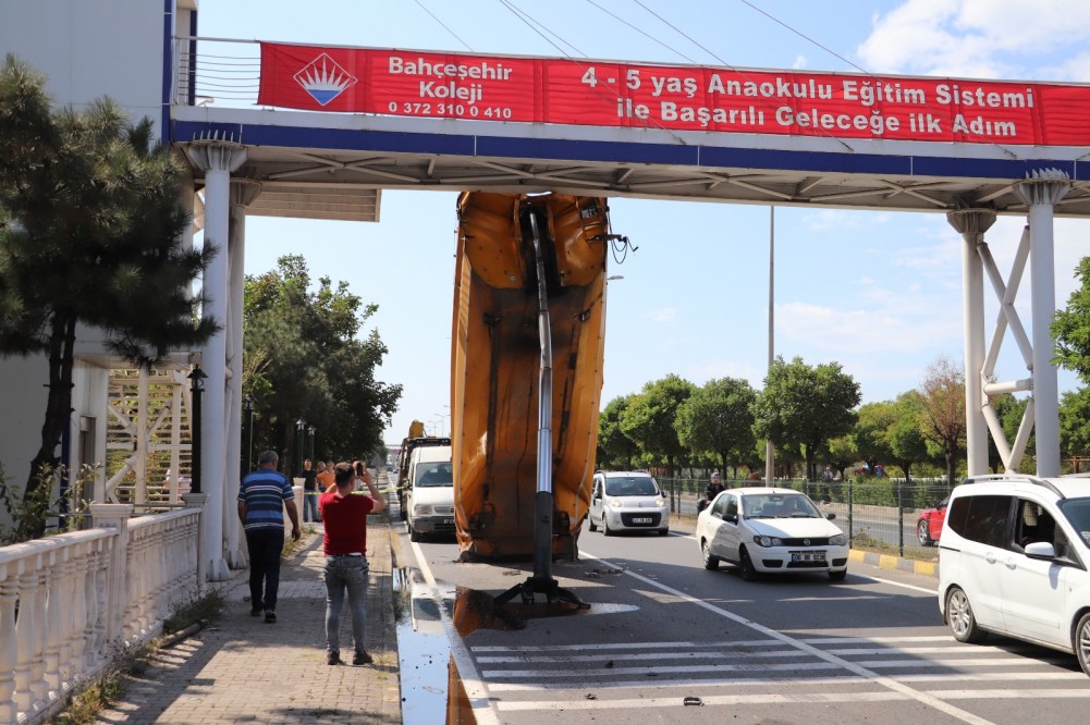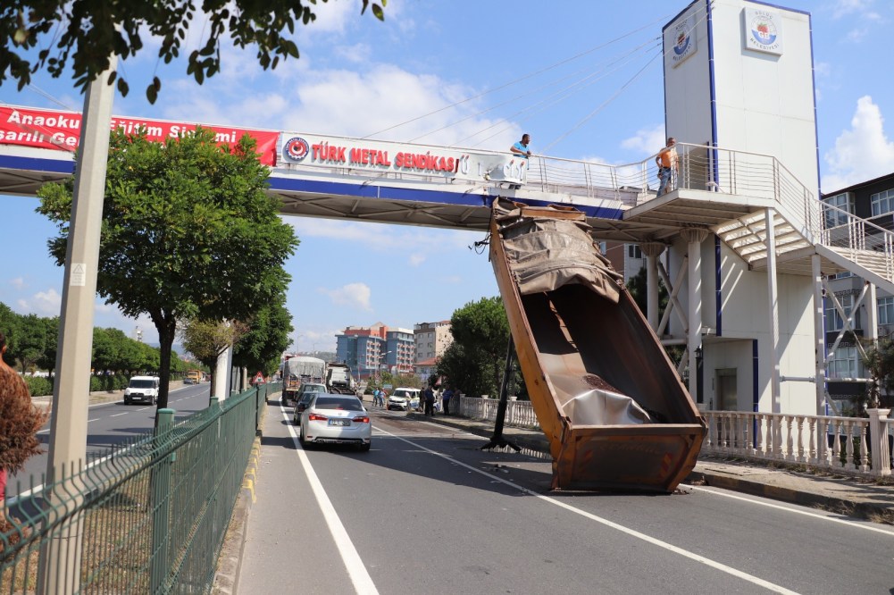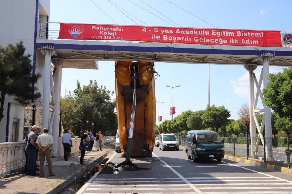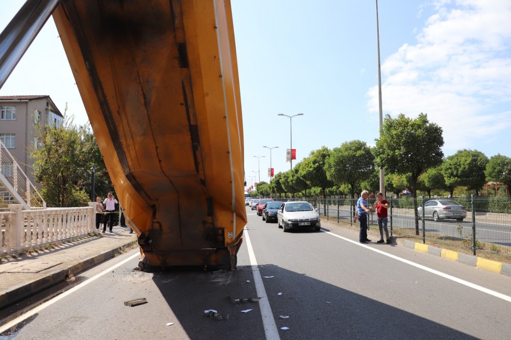 Zonguldak’ın Ereğli ilçesinde TIR’ın açılan Dorsesi üst geçide takıldı. TIR’dan kopan Dorse üst geçide de zarar verdi.