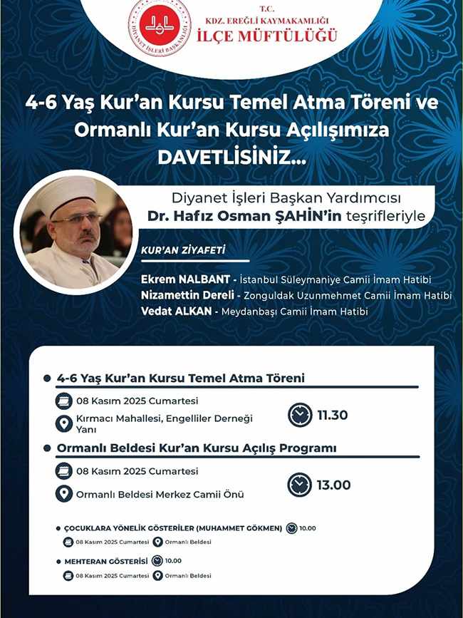 Karadeniz Ereğli Kaymakamlığı İlçe Müftülüğü tarafından 8 Kasım Cumartesi günü, Diyanet İşleri Başkan Yardımcısı Dr. Hafız Osman Şahin’in katılımıyla saat 11:30’da Kırmacı Mahallesi Engelliler Derneği yanında 4-6 Yaş Kur’an Kursu temel atma töreni, saat 13:00’da Ormanlı Beldesi Merkez Camii önünde Kur’an Kursu açılış programı gerçekleştirilecek.