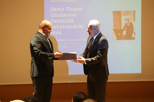 "Deniz Ticaret Odalarının Denizcilik Sektöründeki Rolü"’ başlıklı sunum gerçekleştiren Oğuz Ünlüer’e, sunumunun ardından Yüksek Okul Müdürü Doç. Dr. Nuri Akkaş tarafından teşekkür belgesi verildi.