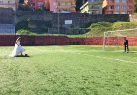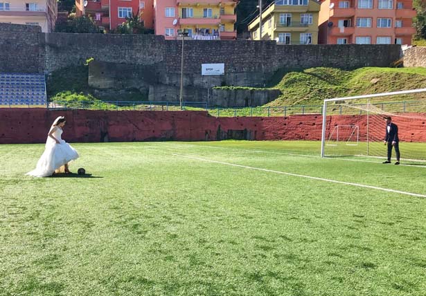 Zonguldak'ın Ereğli ilçesinde amatör küme takımlarından Bayatspor'da forma giyen 29 yaşındaki Fırat Çınar, dünya evine girdi. Damat, düğün törenin ardından eşi Jale Çınar'ı Beyçayırı Sahası'na getirdi. Ardından Damat Fırat kaleye geçerek eşi Jale'ye şut çektirdi. Gelin ve damadın futbol aşkı görülmeye değerdi.