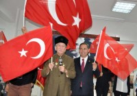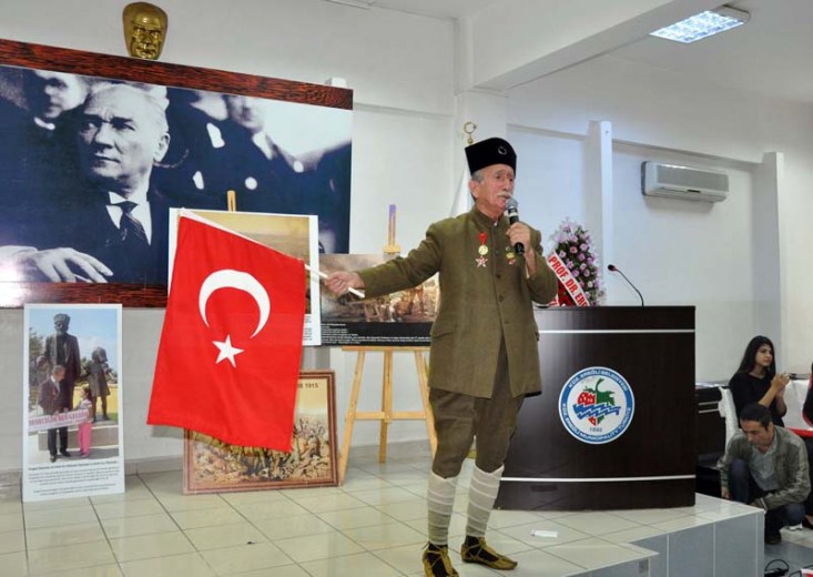 bayraklar eşliğinde konuşan Kaçmaz, Çanakkale Savaşları ve Kurtuluş