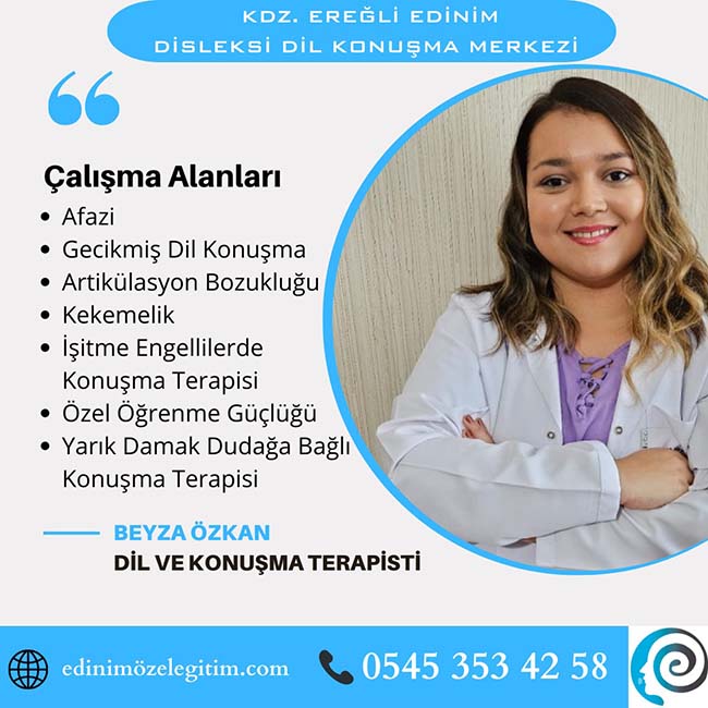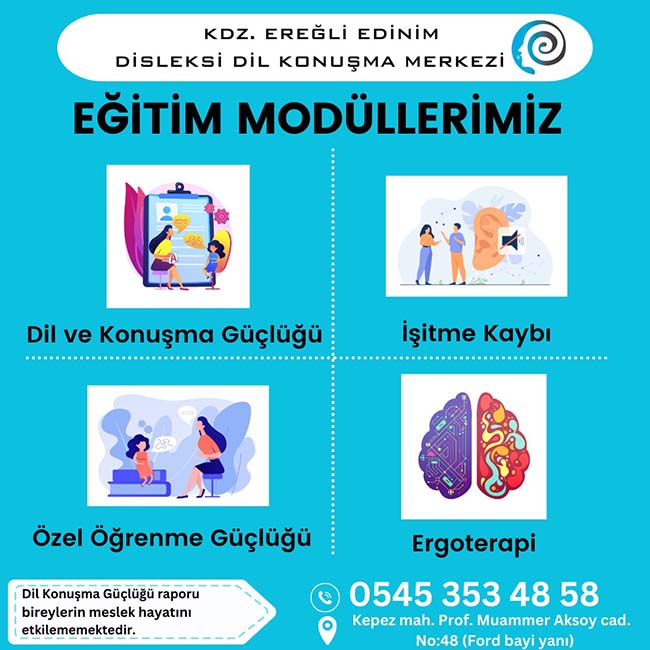 Kdz. Ereğli Edinim Disleksi Dil Konuşma Merkezi, Dil ve konuşma güçlüğü, işitme kaybı, özel öğrenme güçlüğü (Disleksi / Disgrafi / Diskalkuli) ve ergoterapi eğitimleri veriyor.