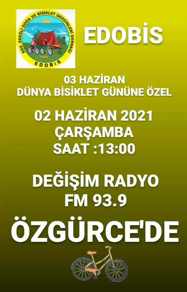 Değişim Radyo(93.9)’da 2 Haziran Çarşamba günü saat 13.00’de, 03 Haziran Dünya Bisiklet Günü nedeniyle Özgürce programına konuk olacak olan EDOBİS üyeleri Dünya Bisiklet Günü ve EDOBİS hakkında açıklamalarda bulunacaklar.