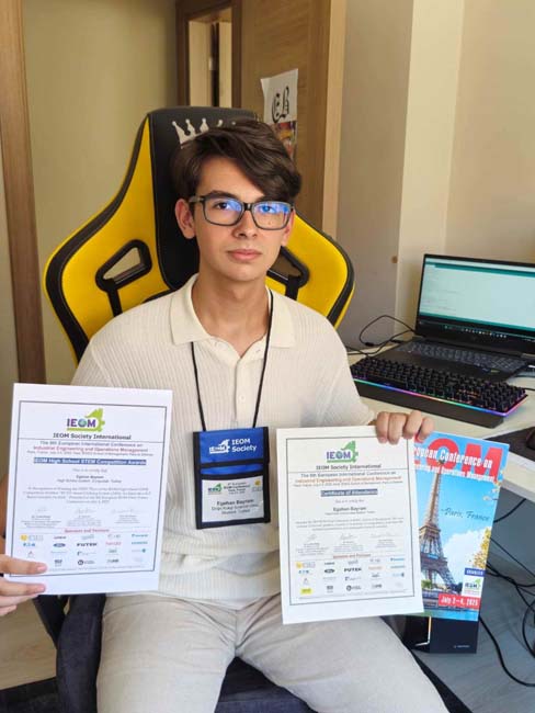 Bayram, "Paris'te kendi kategorimde High School System Computations'da diğer birinci de elde ettim. İsterseniz şimdi projemi anlatmaya başlayayım. Projemizde ilk olarak burada sıcaklık sensörlerimiz var. Bebeğin kendi sıcaklığını ve bebeğin ortamının nemini ve bebeğin ortamının sıcaklığını ölçebiliyor. Ayrıca hijyeni nasıl sağlıyoruz diye sorarsanız kendisi yıkanabilir hale geliyor ve bu şekilde başka cihazlarda uygulanabilir hale geliyor. Bunu bildirimleri nasıl görüyor diye sorarsanız da burada bir adet mobil uygulamamız var. Mobil uygulamada bu veriler geliyor ve eğer belli eşit değerlerini geçerse mobil uygulama bize bildirim gönderiyor. Ayrıca uygulamamızın bir özelliği daha var. Bu özellikte burada takvim sekmemiz var. Takvim sekmemizde ne yapıyoruz diye sorarsanız, burada biraz günlerimiz var. Ve bu günlere tıkladığımız zaman bize o güne ait geçmiş verileri gösteriyor. Her günün saatlik olarak verilerini kaydediyor. Bu projeyi ileride insanlara sunabilmek amaçlı projeyi satmayı planlıyorum. Patent başvurusunu oluşturdum. İleride yapay zeka mühendisliğini planlıyorum. İleride Stanford, MIT, Harvard gibi üniversitelerde okumayı hedefliyorum" şeklinde konuştu.