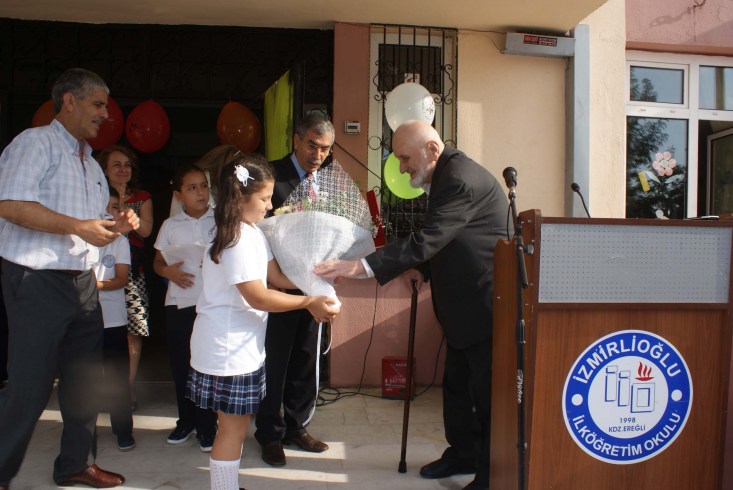 Karadeniz Ereğlili eğitim gönüllüsü hayırsever İbrahim İzmirlioğlu, 2014-205 Eğitim Öğretim Yılı vesilesiyle adını taşıyan İzmirlioğlu İlkokulu'nda düzenlenen törene katıldı.