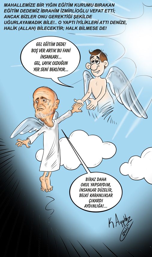 Zonguldak'ın Ereğli İlçesi'nde, Gazete Ereğli Gazetesi'nin Yazı İşleri Müdürü Gazeteci-Yazar-Karikatürist Kurtuluş Ayyıldız, 09 Şubat Pazartesi günü yaşamını yitiren Eğitim Dede Hacı İbrahim İzmirlioğlu'nu (Eğitim Dede), çizdiği karikatürle uğurladı.