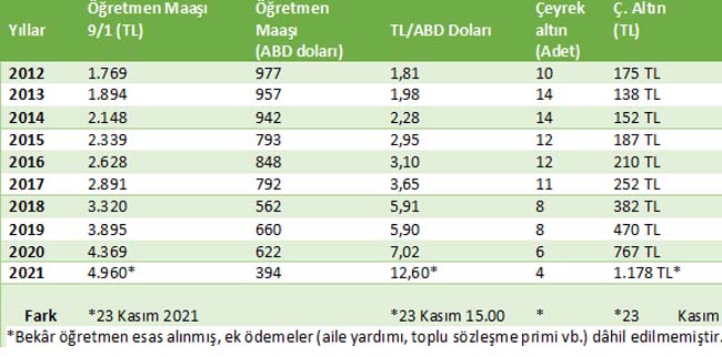 1 ABD dolarının ortalama 1.81 TL olduğu 2012 yılında, 1.769 TL aylık alan 9. derece 1. kademedeki bir öğretmen, maaşıyla 977 ABD doları alabiliyorken, bugün aynı derece ve kademede 4 bin 960 TL alan bir öğretmenin maaşı 394 ABD doları (1 $=12,60 TL) seviyesine inmiştir. 9/1 derecedeki bir öğretmenin maaşı son 10 yılda, dolar bazında neredeyse 2,5 kat erimiştir. Dolar kurunun sürekli artması yaşanan erime sürecinin artarak devam edeceğini göstermektedir. Benzer bir şekilde 2012 yılında 9/1 derecedeki bir öğretmen, maaşı ile 10 çeyrek altın, 2013 ve 2014’te 14 çeyrek altın alabiliyorken, şu anda aynı derecedeki öğretmen aldığı maaşla ancak 4 çeyrek altın alabilmektedir.