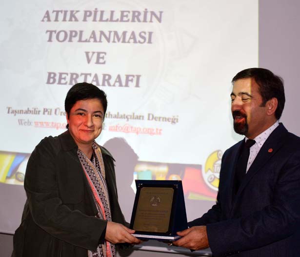 Ülkede atık pillerin kimyasal maddelerinin, doğaya ve ayrıştırılarak metan gazı elde edilen çöpe dahi zarar verdiği vurgulayan Abdullah Ömür, ülke genelinde olduğu gibi Karadeniz Ereğli Belediyesi ile yaptığı çalışmalardan memnun olduğunu belirterek katkılarından ve duyarlılıklarından dolayı TAP adına Belediye Başkan Vekili Esra Alpago'ya bir plaket verdi