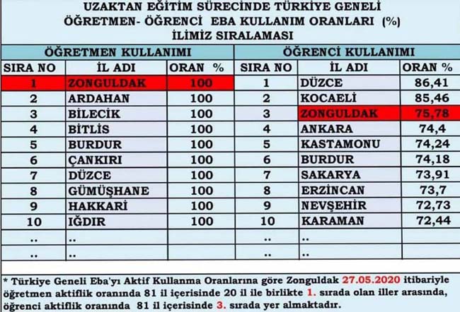 ZONGULDAKÖĞRETMENLERİN EBA KULLANIMINDA BİRİNCİ… ÖĞRENCİLERDE 3. SIRADA