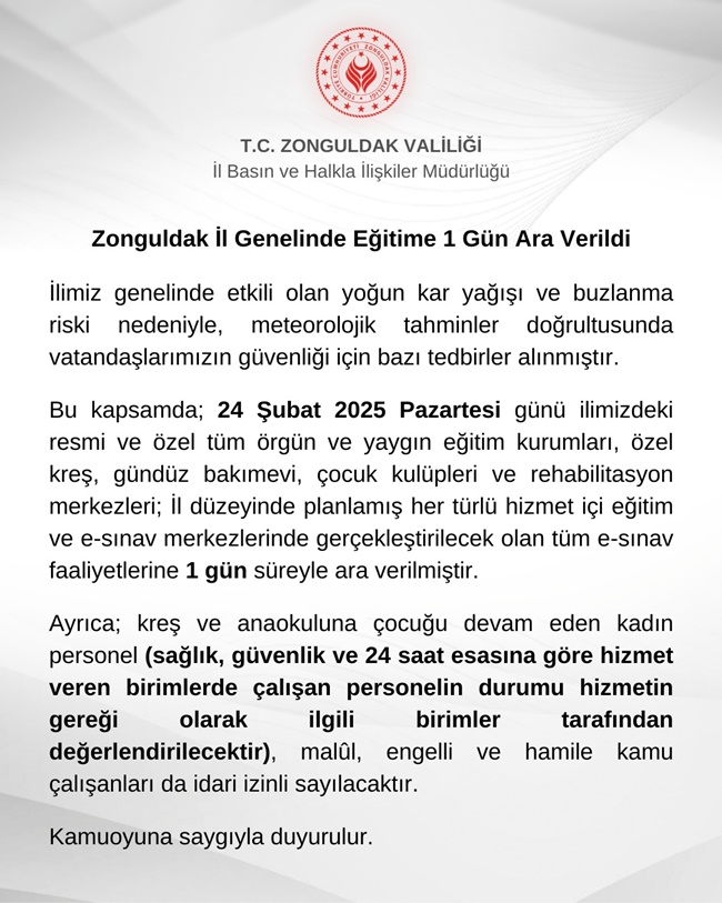 Zonguldak il ve ilçelerinde etkili olan kar yağışı ve buzlanma nedeniyle 24 Şubat Pazartesi günü eğitim öğretime 1 günlük ara verileceği duyuruldu.