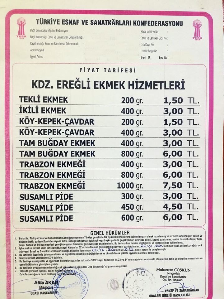 200 gram tekli ekmek 1,5 TL, 400 gram ikili ekmek 3 TL, Köy kepek çavdar ekmeği 200 gram 1,5 TL, Köy kepek çavdar ekmeği 400 gram 3 TL, tam buğday ekmeği 400 gram 3 TL, tam buğday ekmeği 800 gram 6 TL, Trabzon ekmeği 400 gram 3 TL, Trabzon ekmeği 800 gram 6 TL, Trabzon ekmeği 1000 gram 7,5 TL, susamlı pide 300 gram 3 TL, susamlı pide 450 gram 4,5 TL, susamlı pide 600 gram 6 TL.