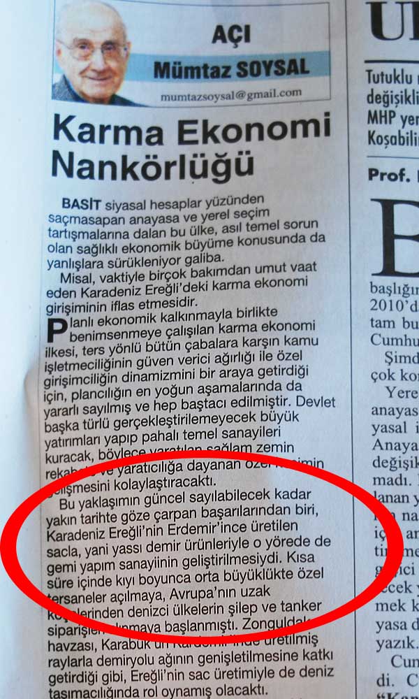 Dışişleri eski Bakanlarından Cumhuriyet Gazetesi Yazarı Mümtaz Soysal, 19.10.2012 tarihli köşe yazısında, ülkenin içinde bulundu ekonomik duruma ilişkin çarpıcı tespitlerde bulundu. Zonguldak doğumlu Prof. Dr. Mümtaz Soysal, kaleme aldığı &8216;Karma Ekonomi Nankörlüğü&8217; yazısında, Ereğli&8217;yi örnek olarak gösterdi. Soysal, Ereğli&8217;de ki yerel gazeteleri de üstü kapalı eleştirdi..!