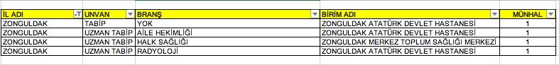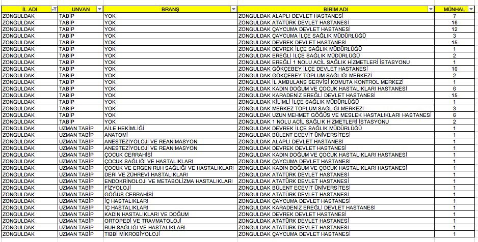 ZONGULDAK ATATÜRK DEVLET HASTANESİ: 17 Pratisyen Tabip, 1 Aile Hekimi Uzmanı (Mazeret Münhal), 1 Deri Ve Zührevi Hastalıkları Uzmanı, 1 Endokrinoloji Ve Metabolizma Hastalıkları Uzmanı, 1 Radyoloji Uzmanı (Mazeret Münhal), 1 Göğüs Cerrahisi Uzmanı, 1 Ortopedi Ve Travmatoloji Uzmanı, 1 Ruh Sağlığı Ve Hastalıkları Uzmanı