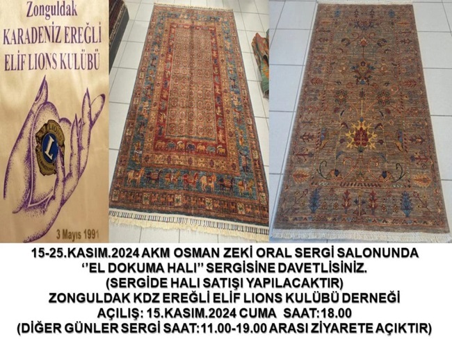 Karadeniz Ereğli Elif Lions Kulübü Derneği tarafından 15-25 Kasım 2024 tarihleri arasında Atatürk Kültür Merkezi(AKM)Osman Zeki Oral Sergi Salonunda "El Dokumalı Halı" Sergisine Karadeniz Ereğli halkı davet edildi.
