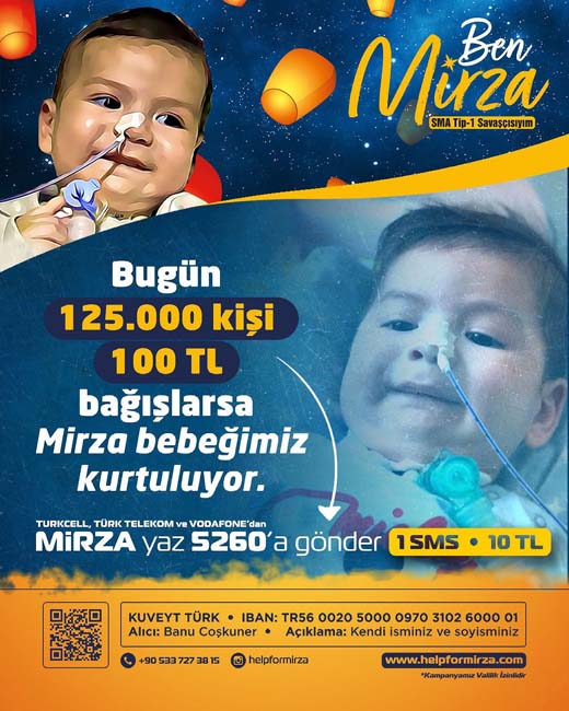 Yardım komisyonundan yapılan açıklamada, kampanyanın amacının en kısa sürede Mirza’yı makinelerden kurtarıp, sağlıkla yaşamına devamını sağlamak olduğu ifade edildi. Açıklamada, “Bu yolda bizimle birlikte olur, instagram sayfamızı takip eder, paylaşımlarda bulunur, Mirza’nın sesinin daha çok insana duyurulmasını sağlarsanız Mirza adına minnet duyar,bir ömür duacınız oluruz.Kampanyamız şuan % 45’te sizin desteğinizle en kısa sürede tamamlayabiliriz. Çaresi olan bir hastalığa küçücük bir bebeği ulaştırmak hepimizin görevi” denildi.