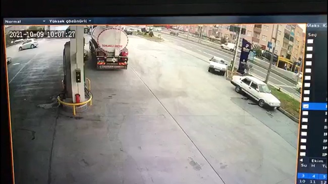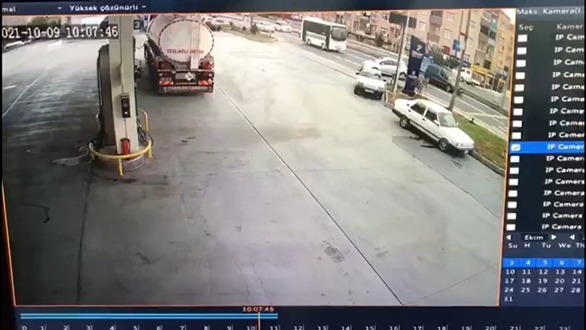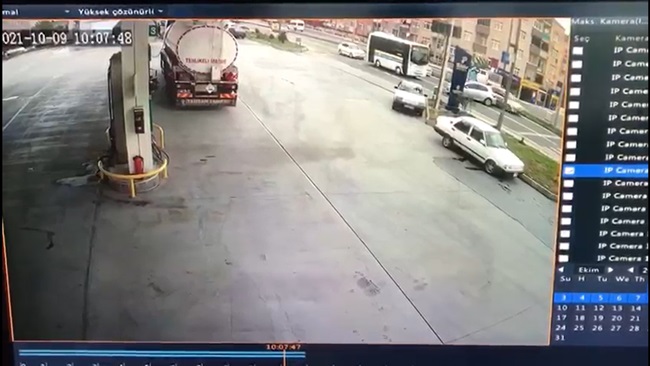 İddiaya göre şehir dışından gelen ve Zonguldak’a giden otomobil sürücüsü ihtiyaç için akaryakıt istasyonuna girdi. El frenini çekmeyi unuttuğu otomobil yavaş yavaş kayarak ana yola girdi. Halk Otobüsü sürücüsü son anda fark ettiği otomobile çarpmamak için dururken, akaryakıt istasyonundan gelen otomobil, halk otobüsünün yanından geçen araca çarptı. Kazayı gören vatandaşlar koşarak kazaya sebep olan otomobili durdurarak yol kenarına aldı. Yaşanan o anlar güvenlik kamerasına yansıdı.