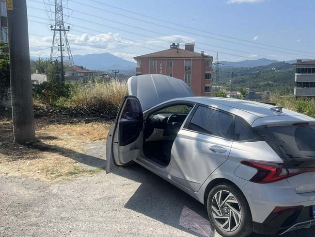 Zonguldak'ın Alaplı ilçesinde elektrik direğinden kopan tellerinden çıkan kıvılcımlarla başlayan alevler, önce otların, sonra aracın yanmasına sebep oldu.