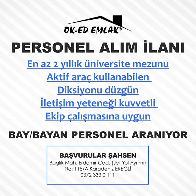 Karadeniz Ereğli’de hizmet veren OK-ED Emlak bünyesinde çalıştırılmak üzere bay/bayan personel aranıyor.
