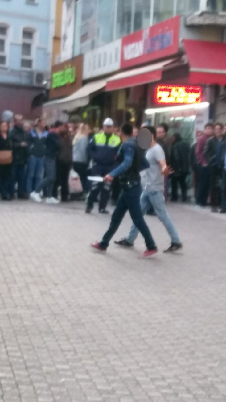 İddiaya göre uyuşturucu madde kullanan Mustafa A., çarşı merkezinde elindeki bıçakla çevredeki vatandaşlara saldırmaya başladı. Durumun polise bildirilmesinin ardından olay yerine gelen polis ekipleri, Mustafa A. yı göz altına almaya çalıştı. Kaçmaya başlayan Mustafa A. girdiği iş yerinde uzun uğraşlardan sonra göz altına alındı. Bu sırada polis ekipleri havaya ateş açarak Mustafa A. yı korkutmaya çalıştı. Göz altına alınan Mustafa A. ifadesi alındıktan sonra adliyeye sevk edilecek.