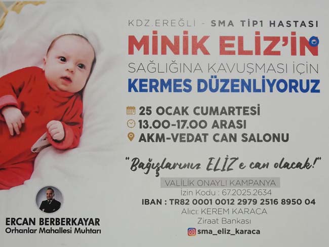 Orhanlar Mahallesi Muhtarlığı, Spinal Musküler Atrofi (SMA) Tip 1 hastası olan Eliz bebek için Zonguldak Valiliği izni ile başlatılan yardım kampanyasına destek olmak için 25 Ocak Cumartesi günü, 13.00 – 17.00 saatleri arasında Karadeniz Ereğli Atatürk Kültür Merkezi (AKM)’de kermes düzenledi.