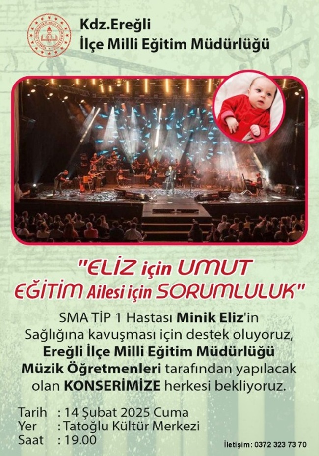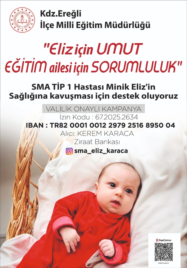 Karadeniz Ereğli İlçe Milli Eğitim Müdürlüğü, toplumsal dayanışma ve insani sorumluluk bilinciyle "Eliz İçin Umut, Eğitim Ailesi İçin Sorumluluk" diyerek önemli bir yardım kampanyası başlattı. Eliz Bebek’in tedavi süreci, maddi olarak büyük destek gerektiren ancak umut dolu bir yolculuk. Bu zorlu süreçte, sadece Eliz Bebek’in değil, ailesinin de dayanışmaya ihtiyacı var. Karadeniz Ereğli İlçe Milli Eğitim Müdürlüğü ve eğitim camiası, Eliz Bebek için birlikte hareket ederek büyük bir destek ağı oluşturmayı planlıyor.
