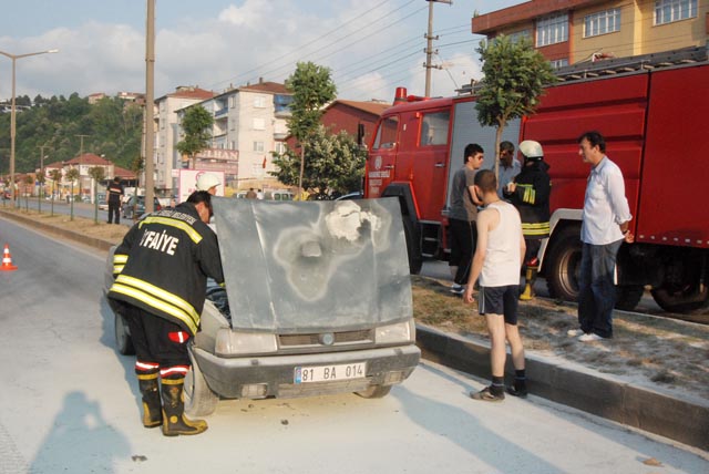 Olay, Yeşiltepe yolu mevkiinde meydana geldi. Yeşiltepe istikametinden Ereğli merkezine giden 81 BA 014 plakalı otomobil yolda aniden alev aldı. Aracın yandığını anlayan sürücü Mecit Yılmaz, otomobili hemen durdurdu. Çevreden yardım isteyen Yılmaz?ın yardımına olay yerinden geçen trafik polisleri koştu. Yangın söndürme tüpü ile otomobile müdahale eden polisler, otomobili kısa sürede söndürdü.