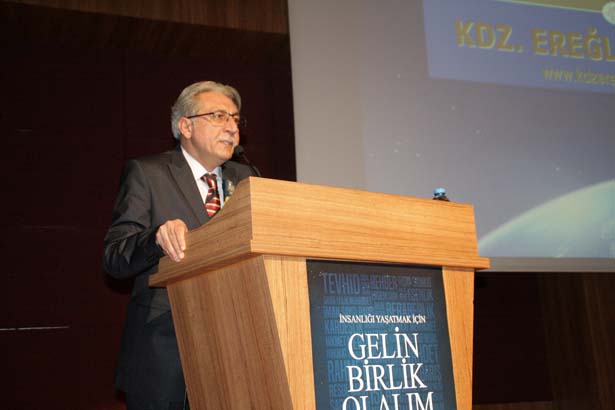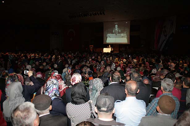 "Bu noktada müsaadeniz olursa içimde olan bir burukluğu bu sahneyi gördükten sonra burada ifade etmeden geçemeyeceğim. Büyük bir kısmınız ayakta kaldınız. Ki burası Ereğli'nin en büyük salonu. Her türlü büyük faaliyetler burada yapılıyor. Gönlümüz şunu isterdi; gerçi bu noktada başkanımızın düşüncelerini az çok biliyorum. Bu kalabalığı büyük bir camiinin gölgesinde bununun 100 katı büyük bir salonda yapmayı çok arzu ederdim. Sizlerin de aynı düşüncelerde olduğunuzu biliyorum. Bu noktada bir tarafta takdirlerimizi sunarken bir taraftan da bu beklentimizi huzurlarınızda başta belediye başkanımıza ve diğer siyasilerimize aktarmış olayım. "