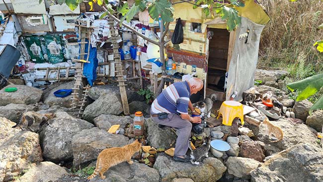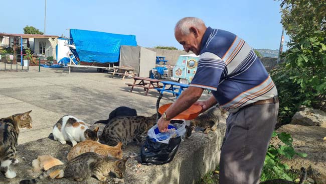 Zonguldak'ın Alaplı ilçesinde yaşayan 72 yaşındaki Hasan Kırmacıoğlu, her gün yürüyerek beş kilometre uzaktaki balıkçı barınağına giderek 100 kediyi kendi imkanları ile besliyor.