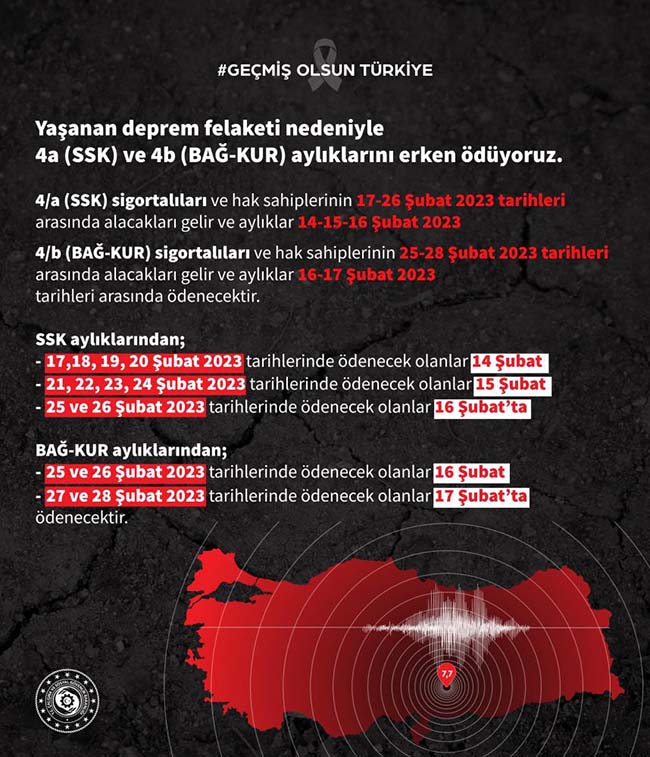 Yapılan açıklamada, 4a (SSK) ve 4b (Bağ-Kur) emekli aylıklarının vatandaşlara erken ödeneceği belirtilerek, 4a (SSK) sigortalılarının aylıklarının 14-16 Şubat tarihinde, 4b (Bağ-Kur) sigortalıların emekli aylıklarının ise 16-17 Şubat tarihinde ödeneceği açıklandı.