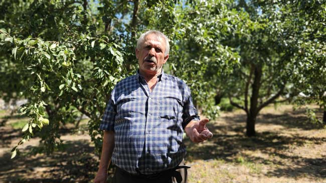 "Bunun projesini kendim yaptım. Bir gün çektim ipleri, hoşuma gitmedi. Söktüm tekrar, bir gün sonra yine çizdim. Enini boyunu ölçtük ondan sonra diktik, güzel göstersin diye. Cenab-ı Allah da verdi. Bakımı yine yaptık. Sürekli bakım yapıyorum. Bakım yapmazsa zaten ağaçlara hastalık girer. Seyretme güzel olursa 60'da kalırsın. Bu yıl 80 ton armut hasadı bekliyoruz nasip olursa. Zonguldak çevresine satıyoruz."