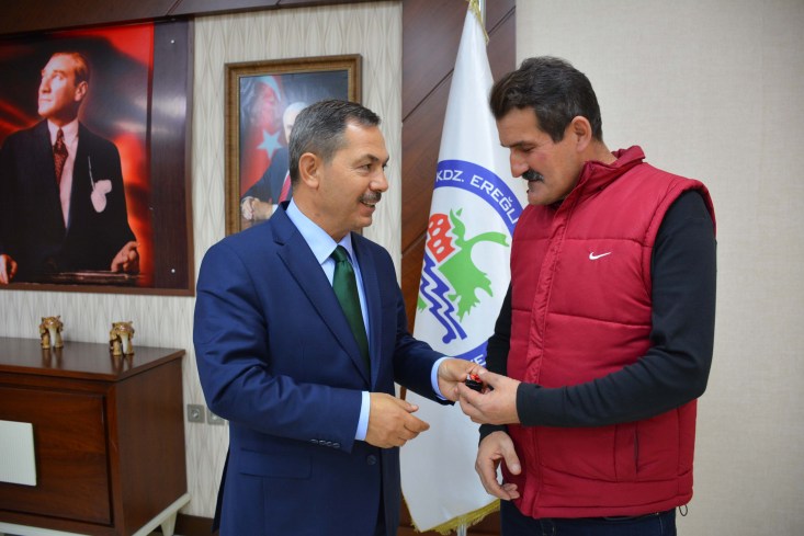 Kdz.Ereğli Belediye Fen İşleri Müdürlüğünde 24 yıl önce göreve başlayan ve ardından uzun yıllar Zabıta Müdürlüğünde görev yapan Zabıta personeli Sezgin Yalçınkaya, Belediye Başkanı Hüseyin Uysal tarafından altınla ödüllendirildi.