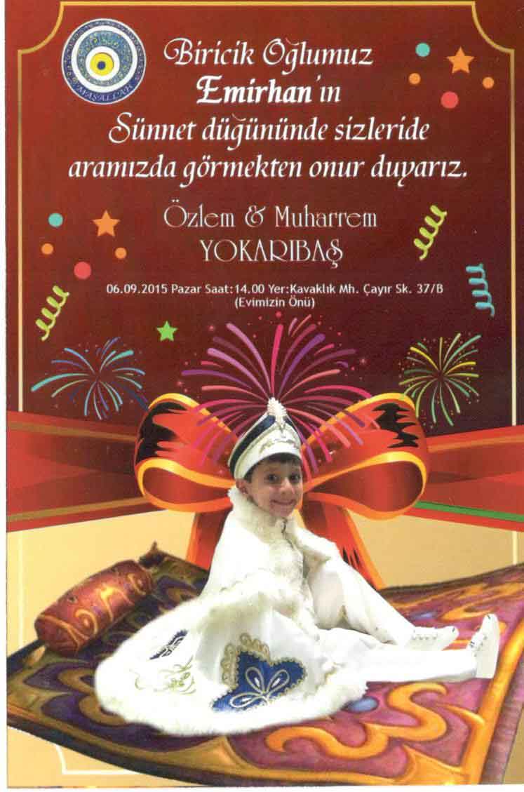 06 Eylül 2015 Pazar günü saat 14.00 itibariyle Kavaklık Mahallesi Çayır Sokak 37/B adresindelki evlerinin önünde gerçekleştirilecek olan sünnet düğününde siyasi olmak üzere iş, sanat ve Yokarıbaş Ailesinin bir araya gelmesi bekleniyor.