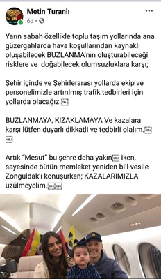 Zonguldak Emniyet Müdürü Metin Turanlı, olumsuz hava koşullarından kaynaklanabilecek olumsuzluklara karşı vatandaşları uyardı. Turanlı, "Artık Mesut bu şehre daha yakın iken, sayesinde bütün memleket yeniden bi'l-vesile Zonguldak'ı konuşurken; kazalarımızla üzülmeyelim" ifadelerine yer verdi.
