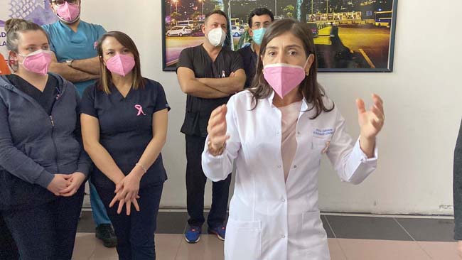 Genel Cerrahi Anabilim Dalı’ndan Prof. Dr. Güldeniz Karadeniz Çakmak, dünya genelinde sağlanan standartları sağlamayı hedeflediklerini ve standartlara da ulaştıklarını söyledi. Çakmak, "Meme kanseri dünya genelinde artık biliyoruz ki kadınlarda en sık görülen kanser türü. Hepimiz zaten biliyoruz. Geçtiğimiz yıla kadar mortalite açısından değerlendirildiğinde genel anlamda akciğer kanserinden sonra ölümcüllük açısından ikinci sırada yer alıyordu. Bazı ülkelerde hala belki ikinci sırada olmasına ve haber dünya genelinde artık ölümcüllük açısından da birinci sırada yer aldığını biliyoruz. Dünya Sağlık Örgütü verileri göz önünde bulundurulursa. 2020 yılı itibarıyla dünyada 2 milyon 300 bin kadına yeni meme kanseri tanısı kondu. Ve ne yazık ki farklı sebeplerden ötürü yaklaşık 685 bin kadını meme kanseri sebebiyle dünyamız kaybetti. Bu oranlar şu anda 5 yıl içerisinde meme kanseri tanısı konmuş yaklaşık 7 milyon 800 bin kadın dünyada yaşamaya devam ediyor. Amacımız bu oranın çok daha artırılması. Şimdi OECD verileri bize söylüyor ki meme kanserinde özellikle verilerin orta ve düşük gelirli seviyeli ülkelerde olduğu. Yani büyük bir bölümü kayıpların yaklaşık üçte ikisini orta ve düşük gelir sahibi olan ülkelerde olduğunu biliyoruz. Bu neden böyle çünkü bu gibi ülkelerde ne yazık ki çok daha ilerlemiş evrede ortaya çıkıyor. Kadınların tanıları ve tedavilerinde gereken standartlar sağlanamıyor. Buna bağlı olarak da hastalarımızı ne yazık ki kaybedebiliyoruz bu noktada meme kanseri ile savaşta hepinizin yapabileceği ile elimizde olan en önemli silahımız erken tanıyı sağlayabilmek. Erken tanıyı sağlayabilmenin en önemli yolu kadınların meme kanserinin problemin büyüklüğünün farkında olmaları. İşte bu çalışmalarımızın hepsinin altında amaç olarak aslında bu yatıyor. Kadınlar farkında olursa bilinçlenirse kontrolleri düzgün yaptırırlarsa biz bu hastalığı artık hekimler olarak tedavi edebiliyoruz. Bu noktada özellikle tanı anına ana kadar kadınların yapması gereken bazı şeyler var neler var kadınlar 25 yaşından itibaren kendi memelerini muayene etmeliler. 40 yaşından itibaren mutlaka doktor muayenesi ve yılda bir monografik tarama programlarına dahil olmaları gerekiyor ki bu hastalık erken teşhis edilebilsin. O noktada tanı basamağında erken tanının sağlanabilmesi adına Radyoloji bölümümüz Radyoloji hocalarımız bize yol gösteriyor. Açıkçası o noktada sıkıntılı her vaka da bize her zaman için her vakamızda desteğini sağlayan Banu hocamız da çok teşekkür etmek istiyorum" diye konuştu.