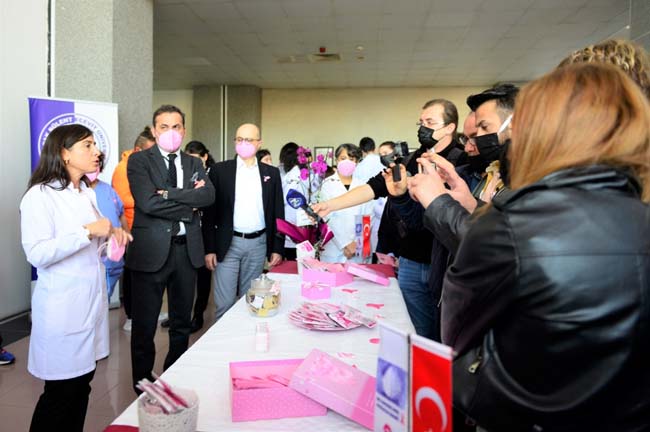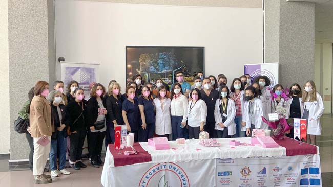 Bursa ONKODAY Derneği ile Batı Karadeniz Meme Hastalıkları Derneği tarafından Prof. Dr. Güldeniz Karadeniz Çakmak başkanlığında ‘Meme Kanseri Farkındalık’ etkinliği düzenlendi. Etkinlikte Başhekim Doç. Dr. Özcan Pişkin'in yanı sıra Fiziksel Tıp ve Rehabilitasyon Anabilim Dalı'ndan Prof. Dr. Selda Sarıkaya, Anesteziyoloji ve Reanimasyon Dalı’ndan Rahşan Dr. Öğretim Üyesi Dilek Okyay, Genel Cerrahi Anabilim Dalı’ndan Prof. Dr. Güldeniz Karadeniz Çakmak, Radyasyon Onkolojisi Anabilim Dalı’ndan Prof. Dr. Hakan Bakkal, Patoloji Anabilim Dalı’ndan Prof. Dr. Burak Bahadır, Radyoloji Anabilim Dalı Başkanı Prof. Dr. Banu Alıcıoğlu katıldı.
