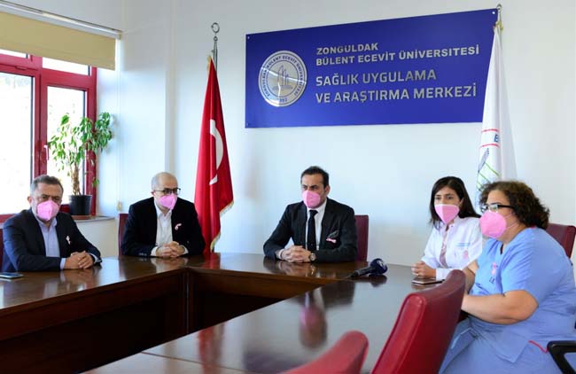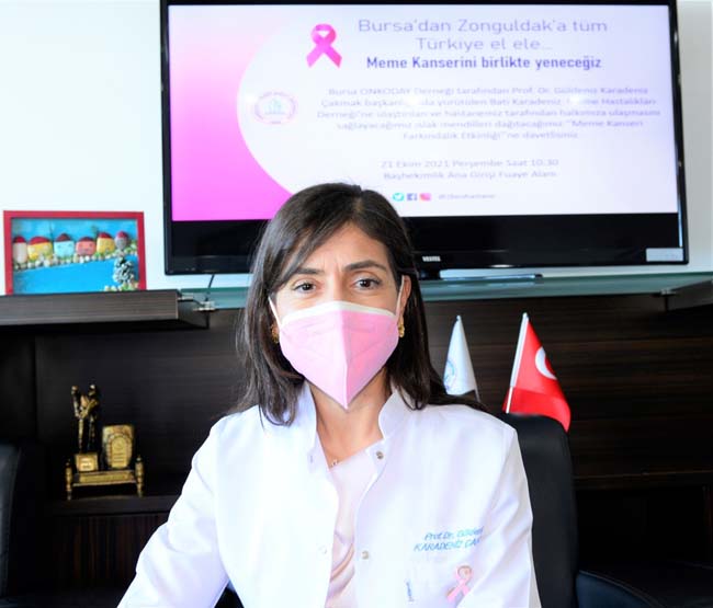 Sağlık Bakanlığı verilerine göre geçen yıl Türkiye'de 25 bin kadına meme kanseri tanısı konulduğunu aktaran Güldeniz Karadeniz Çakmak, "Türkiye verileri yine Dünya sağlık örgütünün 2020 yılında yansıyan verileri doğrultusunda Sağlık Bakanlığımızın verileri göz önünde bulundurulacak olursa geçtiğimiz yıl içerisinde Türkiye'de yaklaşık 25 bin kadına meme kanseri tanısı konduğunu biliyoruz. Vefatlarda tabii Covid-19 dönemi olduğu için açıkçası bu vefatlarla ilgili kayıplar ve sayılarda bazı değişiklikler söz konusu olabiliyor. Vefat sayısı da bine yakın bizim hastanemizde başvuran ve tanı alan hastaların genel anlamda yeni tanı sayısı 300 yakındır. Ama toplamda tedavi gören hasta sayısı binin üzerindedir. Sayılar yalan söylemiyor. Zonguldak üzerinde yansıttığını da şunu söylemeniz gerekiyor Biz Zonguldak'ta popülasyona göre meme kanseri sıklığının daha fazla olduğu gibi bir bu rakama bakarsak sonuç çıkabiliyor. Ama olay o değil de esasen. Biz hastaneniz kapasitesi ve yetkinlikleri sebebiyle sadece Zonguldak ilinden değil çevredeki Batı Karadeniz ve Doğu Karadeniz'in batı tarafından da hastaları kabul ediyoruz. Dolayısıyla da bizim hizmet verdiğimiz hastalarımız sadece Zonguldak yöresine ait değil. O yüzden normal Zonguldak popülasyonunda sahip çok daha fazla meme kanseri hastamız var ve çok daha fazla meme kanseri hastasına takip ve tedavisinde rol almak konumunda kalıyoruz yani ne yazık ki size Zonguldak'ta meme kanseri oranı Türkiye ya da dünya geneline göre daha azdır ya da daha fazla diyemiyorum. Çok geniş bir ağa hizmet ediyoruz. Hastanemizin kapasitesi ve yetkinlikleri sebebiyle. Ama meme kanseri Türkiye genelinde geçtiğimiz 2000’li yılların başından 1980’ler itibariyle göz önünde bulundurursak hem Türkiye hem de dünya genelinde artış gösteriyor. Yıllık 10 binli rakamları gördüğümüzde bu rakam artık 25 binli rakamlarda. 2030’lu yıllarda 35 binli rakamlara çıkacağı öngörülüyor. Amacımız tanı koyduğumuz hastaları mümkün olan erken dönemde yakalanması" şeklinde sözlerine devam etti.