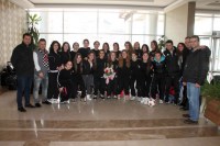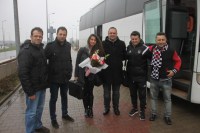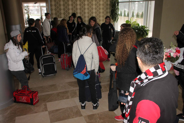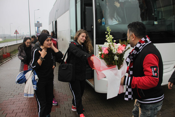 yönetimi tarafından çiçeklerle karşılanan takım oyuncuları ve